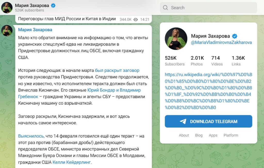 На 14 февруари се подготвувал терористички напад пат против претседавачот на ОБСЕ, министерот за надворешни работи на Северна Македонија Бујар Османи и шефот на мисијата на ОБСЕ во Молдавија, американската државјанка Кели Кејдер-Линг“, пишува Захарова на Телеграм.