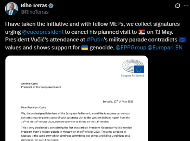 Известителот на Европскиот парламент за Косово, Рихо Терас објави на Х дека покренува иницијатива за собирање потписи од други европратеници за петиција со која се повикува претседателот на Европскиот совет, Антонио Кошта, да ја откаже планираната посета на Белград.
