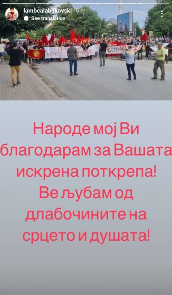 Алабаковски на „Инстаграм“ прво сподели инсерт од драмата „Диво месо“ на Горан Стефановски, а потоа и фотографија од протестот кој беше организиран под мотото „Слобода за Ламбе“.