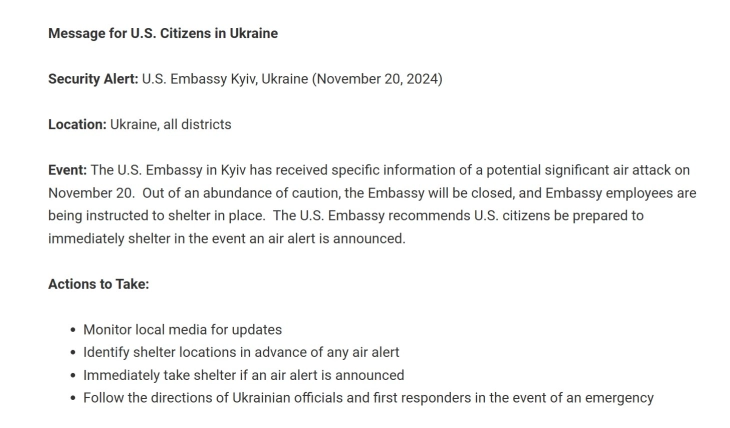 Американската Амбасада во Киев е привремено затворена откако добила „конкретни информации за потенцијален значаен воздушен напад на 20 ноември“.