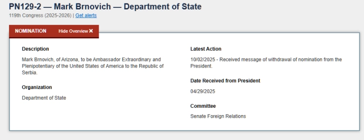 Администрацијата на американскиот претседател Доналд Трамп ја повлече номинацијата на Марк Брновиќ за амбасадор во Србија, наведено е во одлуката објавена на веб-страницата на Комитетот за надворешни работи на Сенатот на САД.