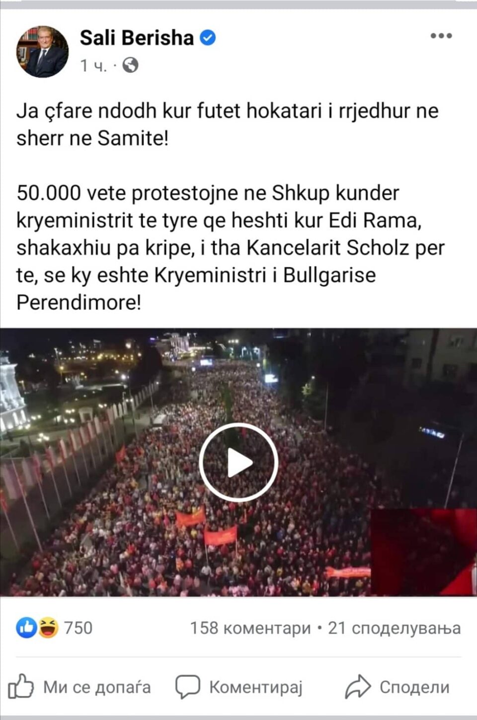 „50.000 луѓе протестираат во Скопје против нивниот премиер кој молчеше кога Рама, шегаџијата без сол, му рече на Канцеларот Шолц, овој е премиерот на Западна Бугарија!“ – пишува Бериша.
