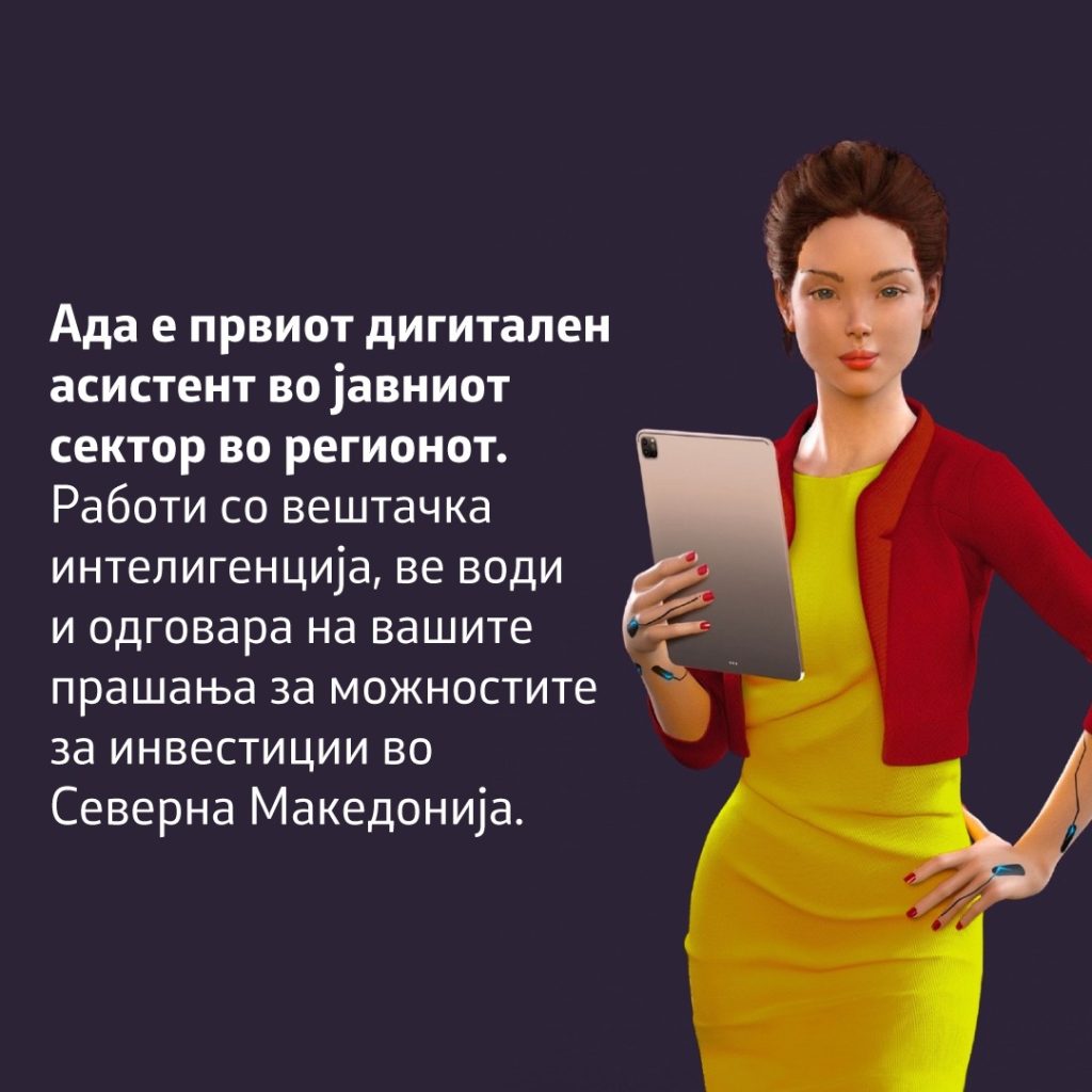 Дигиталниот асистент АДА се работи преку проект на Фондот за иновации и технолошки развој кој беше спроведен како предизвик за домашната старт ап заедница на кој победи фирмата CodeWell. АДА е првиот дигитален асистент во јавниот сектор во регионот кој работи на вештачка интелигенција, ве води и одговара на прашања за можностите за инвестиции во нашата земја и наскоро истиот ќе биде детално промовиран.