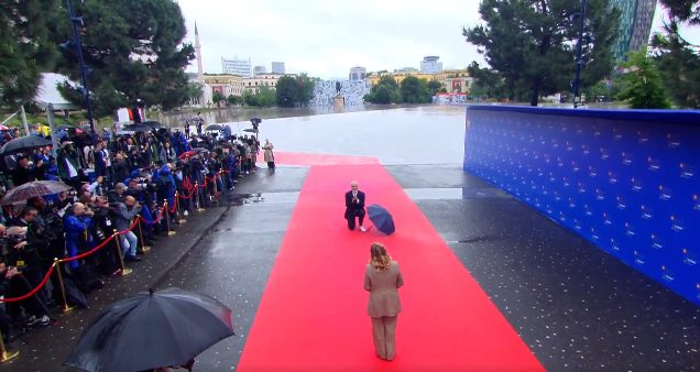 Откако два часа стои со чадор и ги пречекува лично лидерите на црвениот тепих што доаѓаат на самитот, Рама клекна – давајќи и посебен третман на италијанската премиерка.