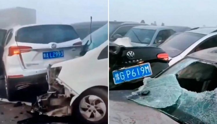 На снимките од воздух се гледаат автомобили, комбиња и камиони натрупани на дел од автопатот во густа магла. До несреќата дошло поради слаба видливост поради магла, јавуваат државните медиуми.