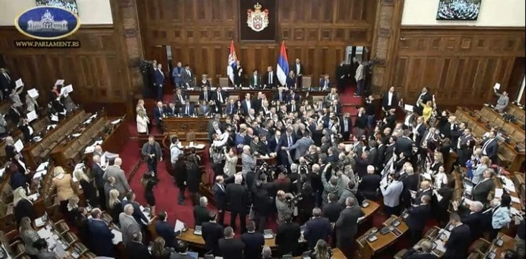 Седницата на српското Собрание на која се расправа за Предлог-буџетот за 2025 година е прекината поради инцидент, туркања и физичка пресметка на пратениците од владејачката коалиција и опозицијата, јави дописникот на МИА од Белград. До инцидент дојде кога пратениците на владејачката коалиција и на опозицијата дојдоа на говорницата држејќи транспаренти, по што имаше извици, меѓусебно … Continue reading (Видео) Физичка пресметка меѓу пратениците од власта и опозицијата во српското Собрание