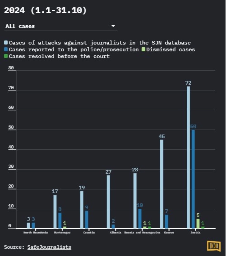 Во изминатите три години, мрежата „Безбедност за новинарите“ (SafeJournalists Network – SJN) регистрирала 633 напади врз новинари во регионот на Западен Балкан, од кои само 49 биле правно решени.