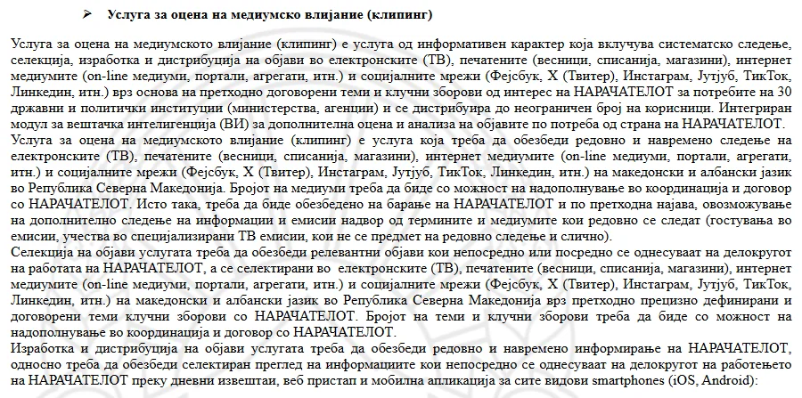 Во техничката спецификација на тендерот, објавена на страната на Бирото за јавни набавки без предвидениот буџет, стои дека фирмата која ќе биде избрана треба да овозможи услуга за оценка на медиумското влијание или клипинг, селекција, изработка и дистрибуција на објави во печатените, електронските, интернет медиумите и на социјалните мрежи. Софтверот треба да овозможи податоци за медиумот кој ја објавил веста и име на авторот на веста.