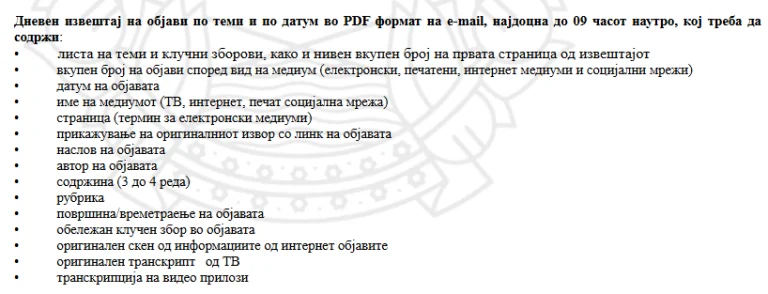 Исто така, бара да има дневен извештај за тековниот ден најдоцна до 9 часот наутро следниот ден каде ќе бидат собрани сите податоци, кои теми се обработувани, од кои медиуми, кога е објавено, линк до објавата, наслов, автор, кратка содржина, транскрипција на видео прилози итн. Ќе се мониторираат медиумите и објавите на социјалните мрежи и на македонски и на албански јазик.