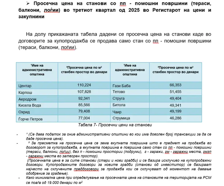 – Во овој квартал најголема постигната цена на стан по метар квадратен е од 182.404 денари, односно во висина од 246.171 евра за вкупна површина од 83 метри квадратни кој се наоѓа на територијата на административна општина Центар, покажува најновиот Извештај од Регистарот на цени и закупнини, што го објавува Агенцијата за катастар на недвижности.