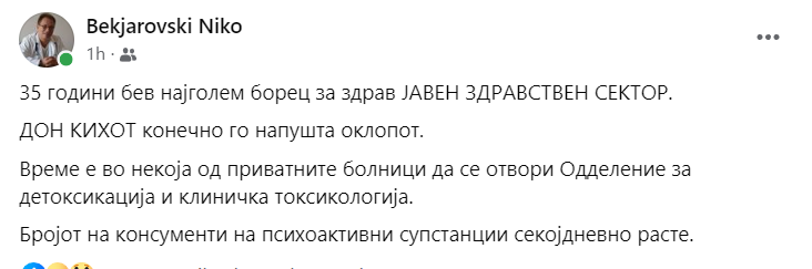 Беќаровски на неговиот Фејсбук профил објави статус по кај граѓаните се наметнува впечатокот дека тој си заминува од Токсикологија, клиника во која долги години успешно работеше.