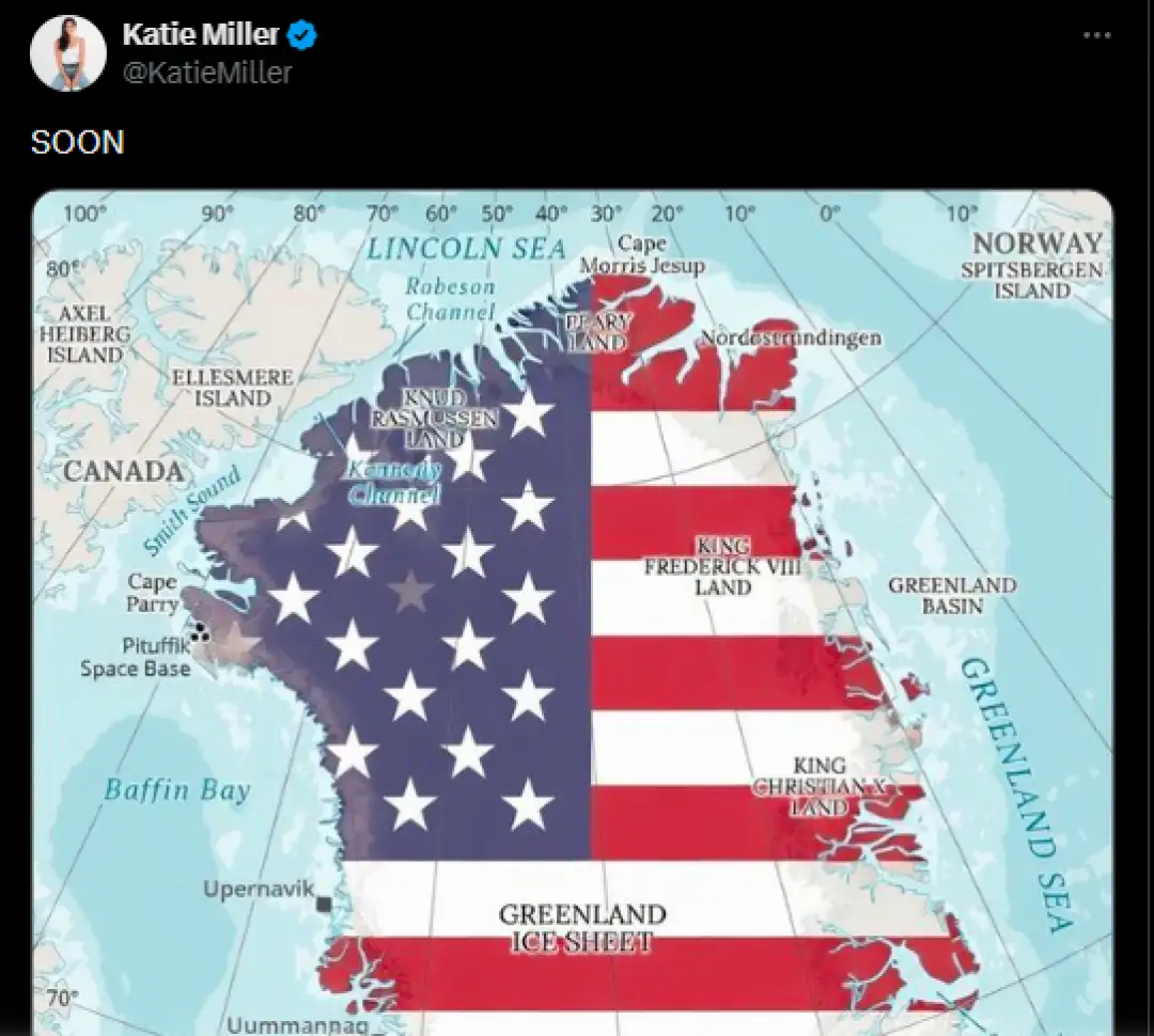 Дополнителни тензии предизвика објавата на Кејти Милер, десничарска подкастерка и сопруга на Стивен Милер, моќниот заменик-шеф на кабинетот на Трамп за политика. Доцна синоќа, таа сподели мапа на Гренланд на социјалната мрежа X со американско знаме поставено над неа, заедно со краток коментар: „НАСКОРО“.
