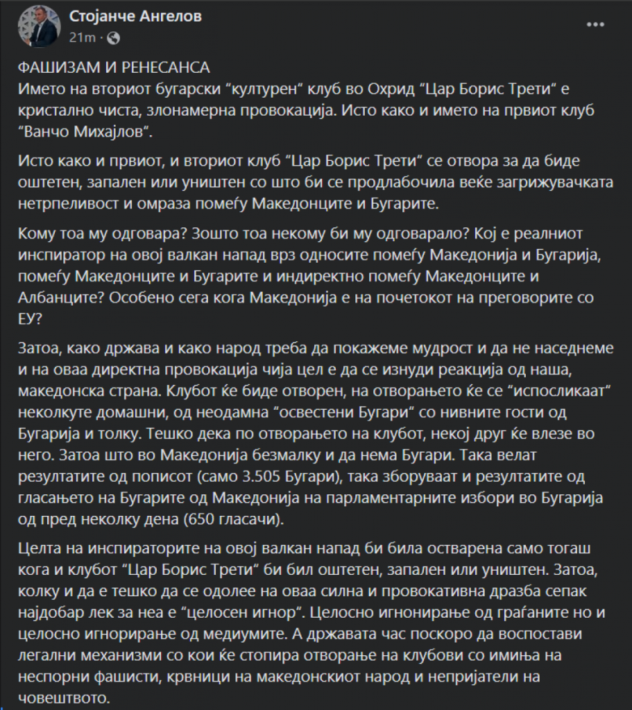 Името на вториот бугарски “културен” клуб во Охрид “Цар Борис Трети” е кристално чиста, злонамерна провокација. Исто како и името на првиот клуб “Ванчо Михајлов”, напиша на својот Фејсбук профил Стојанче Ангелов пред утрешното отворање на бугарскиот центар во Охрид.