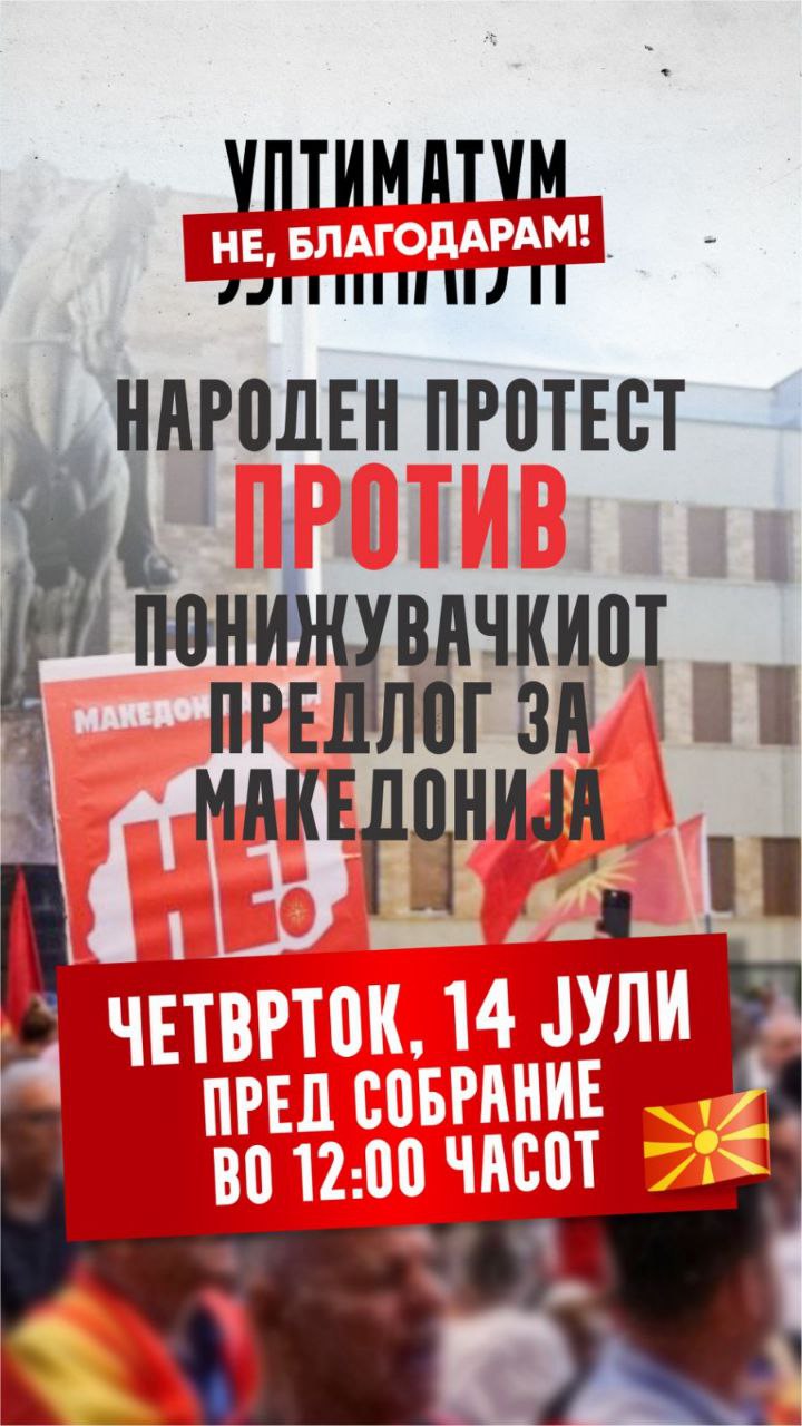 -Масовно да излеземе и да кажеме НЕ за предлогот кој се прифаќаат сите бугарски услови. Власта е должна да го слуша гласот на народот кој е против ваков ултиматум со кој се бугаризираат македонскиот идентитет, јазик и историја. Да излеземе и достоинствено да кажеме „Ултиматум – Не благодарам“, велат од „Ултиматум, не благодарам“.