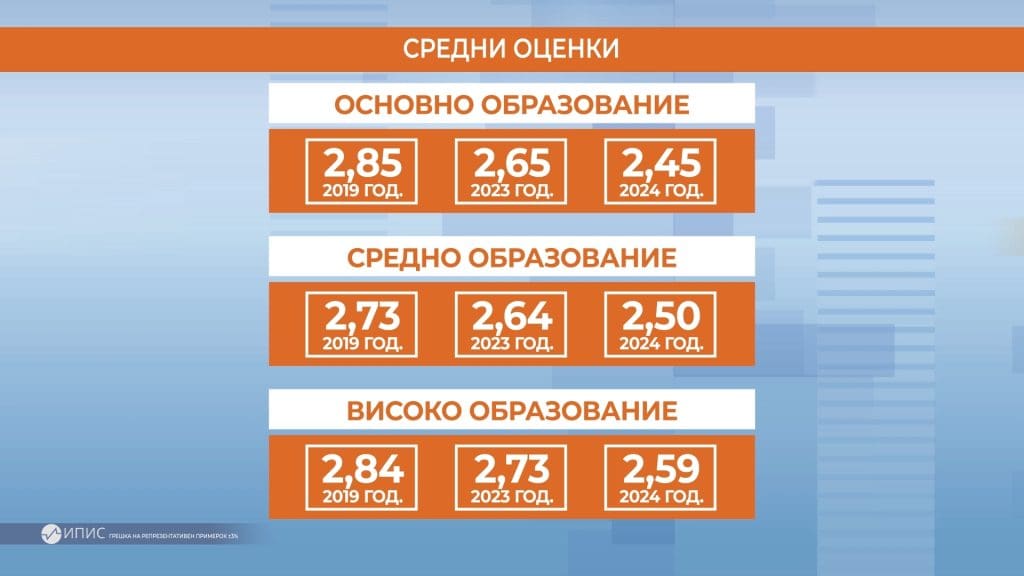 Очекувано, образованието односно просекот на оценките на основното, средното и високото образование е слаба „тројка“ и тоа на самата граница со „двојка“ . Најлоша оценка има основното образование. Средната оценка на граѓаните за основното образование е 2,45, што е најслаба оценка во анкетите на Детектор во последните 5 години. Ако во 2019 граѓаните основното образование го оцениле со 2,85, лани таа оценка се спуштила на 2,65 а годинава на рекордно ниски 2,45.