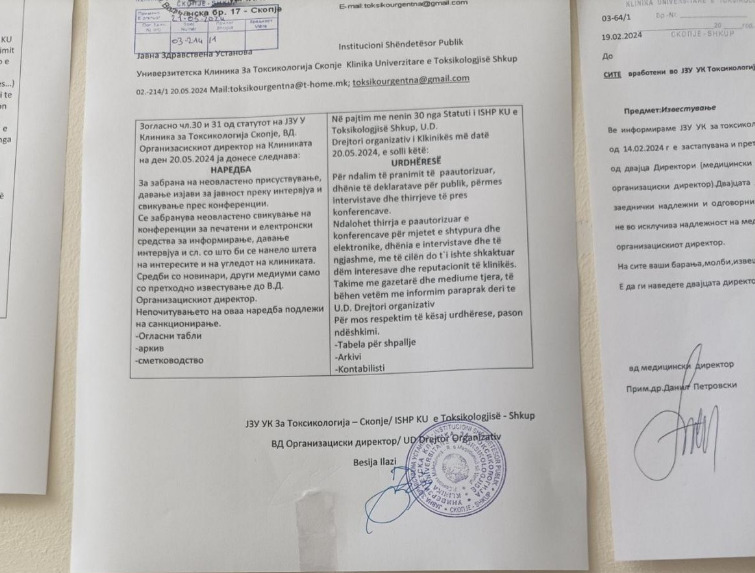„Клиниката за Токсикологија Скопје, ВД. Организацискиот директор на Клиниката на ден 20.05.2024 ја донесе следнава НАРЕДБА за забрана на неовластено присуствување, давање изјави за јавност преку интервјуа и свикување прес конференции. Се забранува неовластено свикување на конференции за печатени и електронски средства за информирање, давање интервјуа и слично со што би се нанело штета на угледот на клиниката. Средби со новинари, други медиуми само со претходно известување до В.Д. Организацискиот директор. Непочитувањето на оваа наредба подлежи на сакнционирање“, се наведува во наредбата.