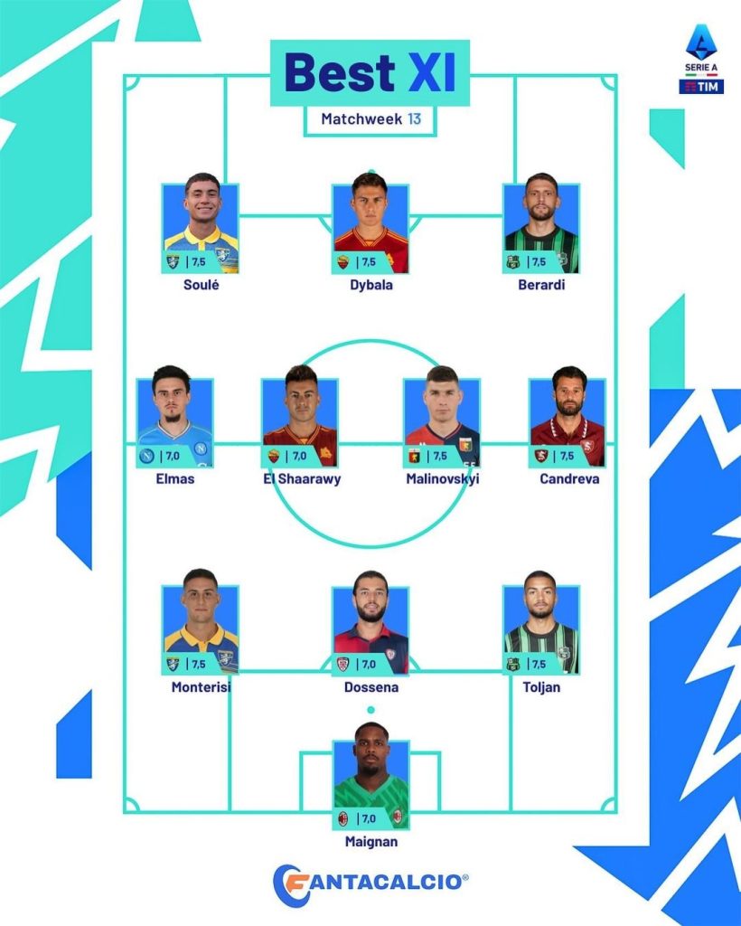Покрај Елмас, меѓу најдобрите 11 се и Суле (Фросиноне), Дибала (Рома), Берарди (Сасуоло), Ел Шарави (Рома), Малиновски (Џенова), Кандрева (Торино), Монтеризи (Фросиноне), Досена (Каљари), Тољан (Сасуоло) и Мањан (Милан).