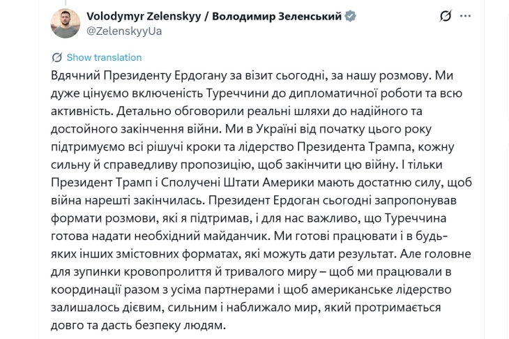 По разговорите со турскиот претседател Реџеп Таип Ердоган во Анкара, Зеленски нагласи дека Украина од почетокот на годинава го поддржа секој одлучен чекор и лидерство на Трамп, „секој силен и фер предлог насочен кон ставање крај на војната“.