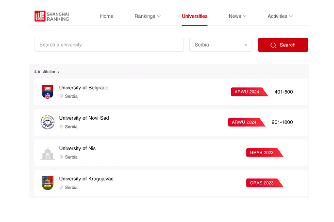 Од Србија во ТОП 1 000 се Белград и Нови Сад, според Џиао Тонг (Jiao Tong), но во рангирање според области, т.н. Global Ranking of Academic Subjects (GRAS), се појавуваат и Ниш и Нови Сад, што значи дека барем во една област овие универзитети влегуваат во врвните 1 000.