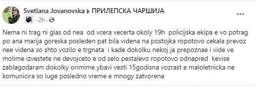 Апелот на социјалните мрежи е споделен од Светлана Јованоска, која пишува дека девојчето во последно време било многу затворено и не комуницирало со луѓе.