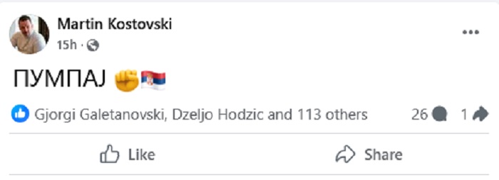 Организацискиот секретар на Социјалдемократскиот сојуз (СДСМ), Мартин Костовски, на својот приватен фејсбук-профил објави порака „Пумпај“, слоган што секојдневно се користи на студентските протести во Србија.