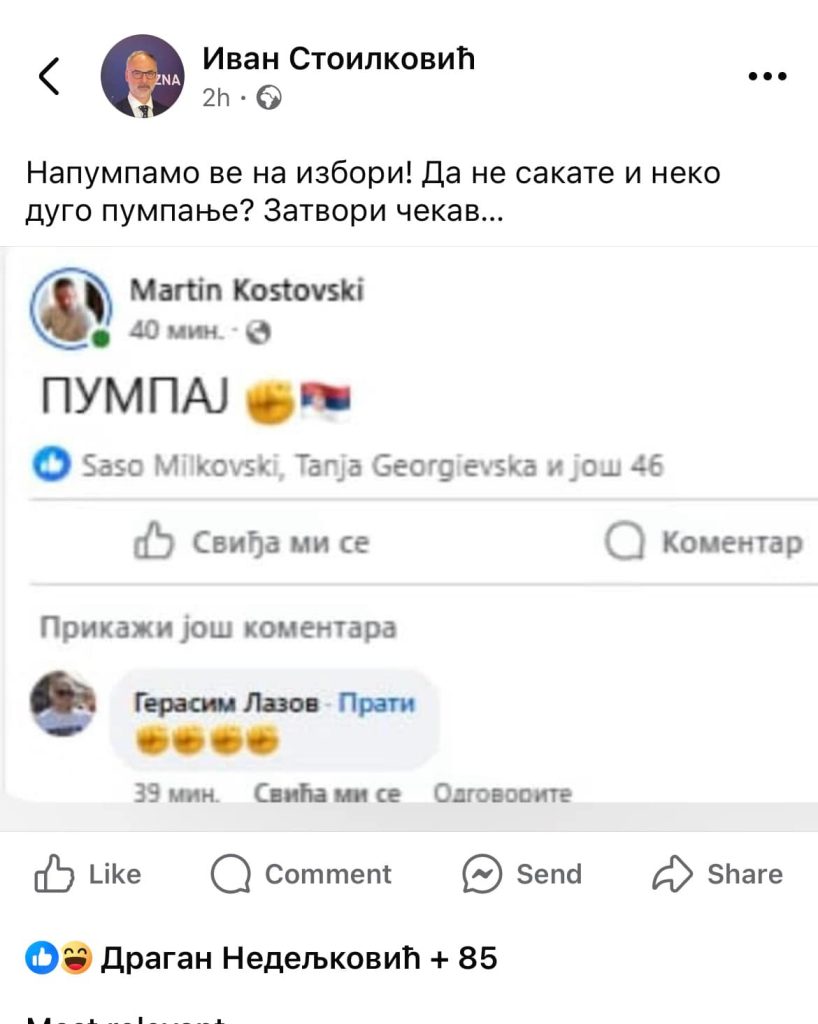 „Напумпамо ве на избори. Да не сакате и неко друго пумпање? Затвори чекав …“, пишува Стоилковиќ.