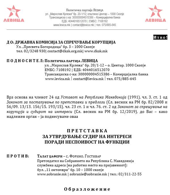 Имајќи го предвид ова, Левица – како опозициска парламентарна партија – бара од ДКСК, да ја констатира оваа противуставна состојба на неспојливост на функциите кои ги извршува Талат Џафери, како и да преземе идни мерки за нејзино отстранување – со барање оставка на Џафери од една од функциите кои нелегално ги извршува.