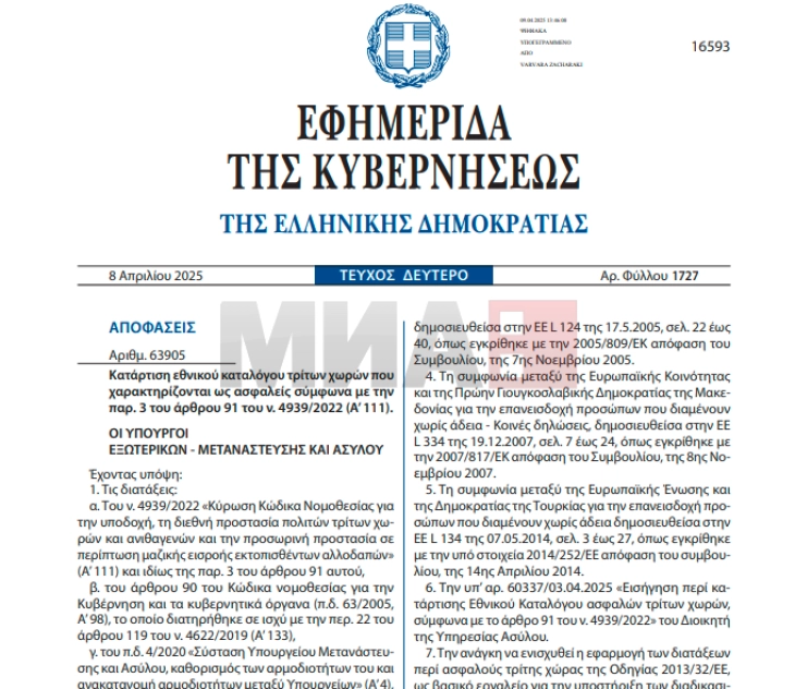 Преку заедничка министерска одлука на грчките министри за миграција и азил и за надворешни работи, Северна Македонија и Албанија, Грција ги карактеризира како безбедни земји за баратели на меѓународна заштита кои преку границите од овие држави нелегално влегле на грчка територија, а истото важи и за Турција, но за мигранти, кои се од Сирија, Авганистан, Пакистан, Бангладеш и Сомалија, јави дописничката на МИА од Атина.