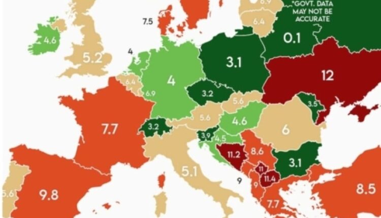 Новата мапа на невработеност за 2026 година покажува значителни разлики меѓу европските земји, а Македонија, со стапка од 11,4 проценти, е најлошо рангирана меѓу земјите со поизразени проблеми на пазарот на трудот, заедно со Босна и Херцеговина со 11,2 и Косово со 11 проценти. Полоша е единствено Украина која е зафатена со војна, со стапка од 12 проценти.