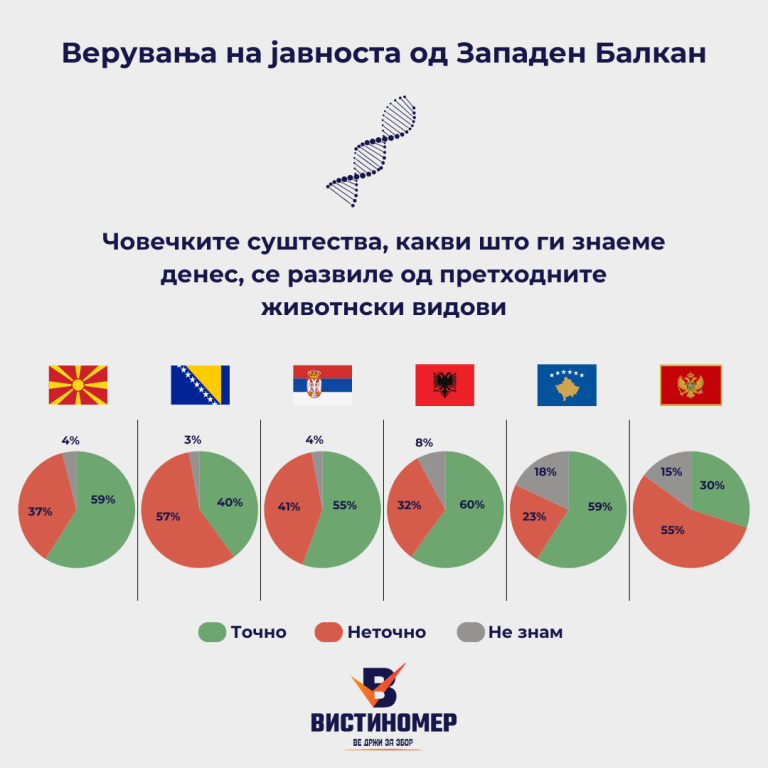 Од друга страна, поохрабрувачки се следните неколку прашања. На пример, на прашањето „човечките суштества, какви што ги знаеме денес, се развиле од претходните животински видови“ дали мислат дека е точно или неточно, 59 отсто сметаат дека е точно наспроти 37 отсто оние кои мислат дека не е точно.