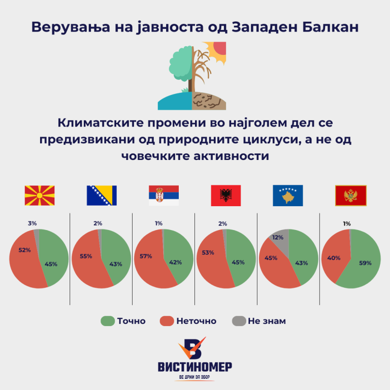 Слични резултати имаше и на прашањето „Климатските промени во најголем дел се предизвикани од природните циклуси, а не од човечките активности“ каде 52 отсто не се согласуваат, односно сметаат дека климатски промени се предизвикани од човековата активност. Наспроти 45 отсто кои се согласуваат дека промените од климата се дел од природните циклус на планетата.