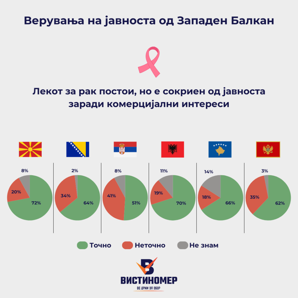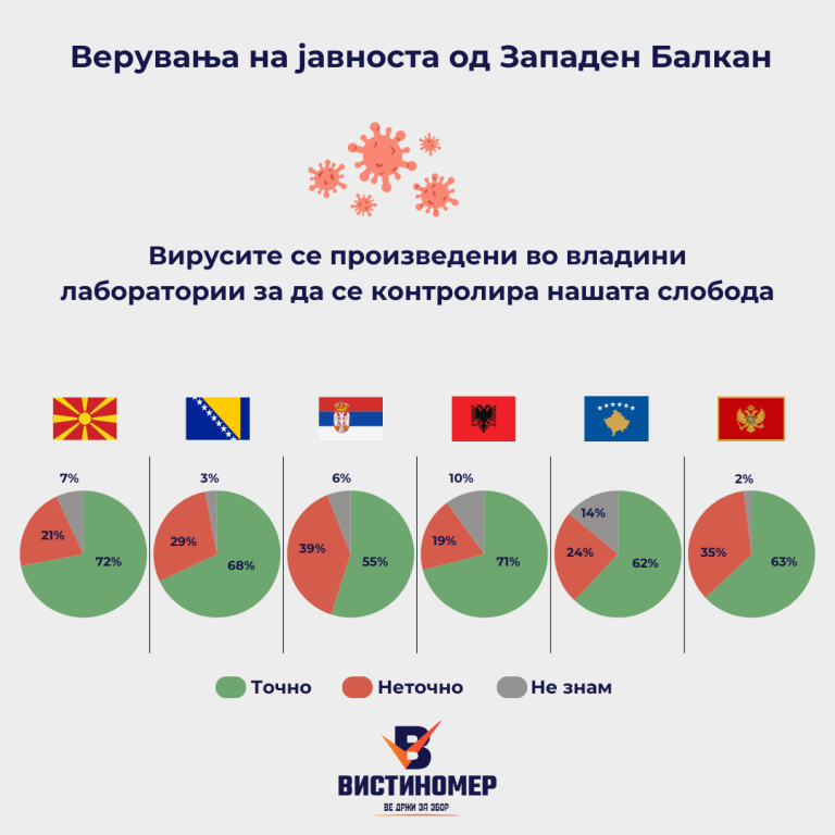Слично, на прашањето дали сметаат дека исказот „Вирусите се произведени во владини лаборатории за да се контролира нашата слобода“, е точен или неточен, 72 отсто од граѓаните сметаат дека е точен. Наспроти само 21 отсто коишто сметаат дека не е точен и 7 отсто кои не знаат. Повторно, најголема стапка на согласување имаат нашите сограѓани споредбено со другите балкански земји: