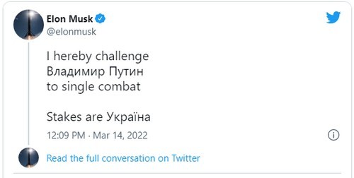 „Со ова го предизвикувам Владиир Путин на борба“ напиша Маск делумно на англиски, а делумно на руски.