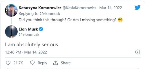 Маск претходно го поддржа отпорот што Украинците го водат за истиснување на руската инвазија, со тоа што, меѓу другото, воспостави сателитски интернет во Украина преку својот систем „Старлинк“.