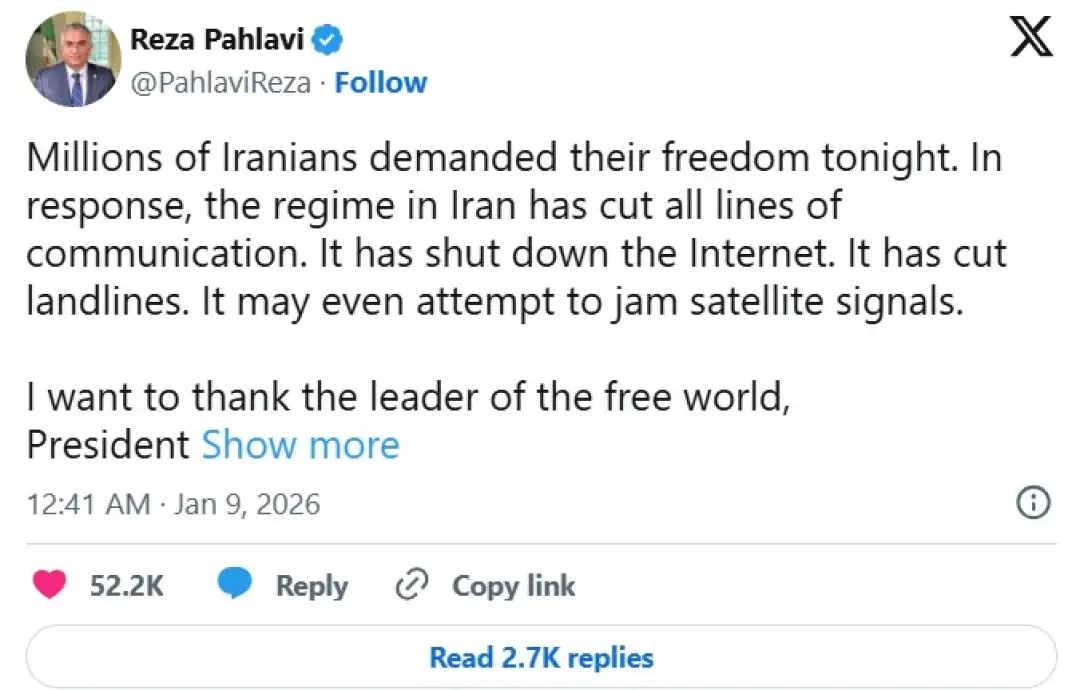 Во објава на социјалната мрежа X, Пахлави рече дека „милиони Иранци ја бараа својата слобода вечерва“, опишувајќи ги демонстрантите како негови „храбри сонародници“ и му се заблагодари на Трамп.