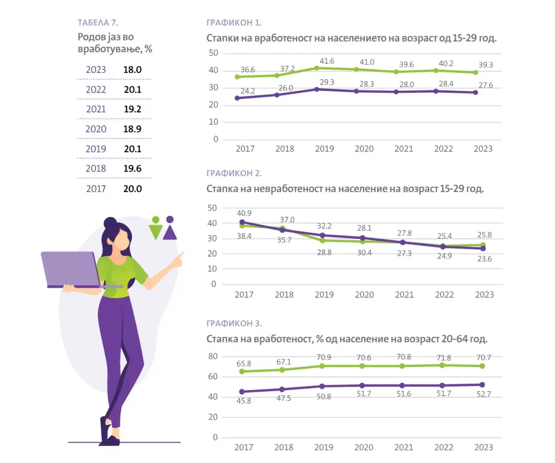 Стапката на вработеност е најголема кај жените и мажите на возраст од 25-49 години. Кај младото население на возраст од 15 до 29 години стапката на вработеност во 2023 година изнесува 33.6%. Стапката на вработеност кај девојките и жените од истата возрасна група изнесува 27.6%, наспроти 39.3% кај момчињата и мажите.