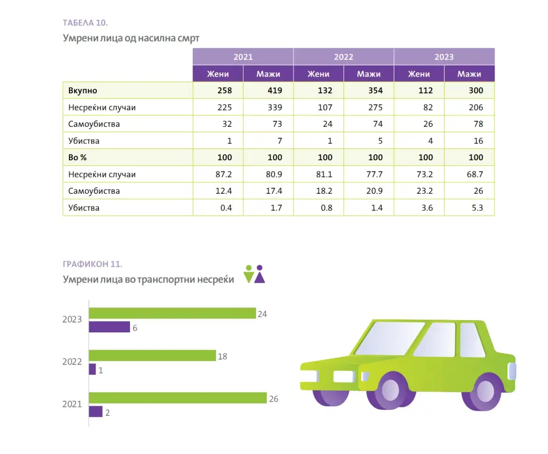 Во 2023 година во вкупниот број случаи на насилна смрт (412) најголемо учество имаат „несреќните случаи“ со 69.9%, каде жените учествуваат со 28.5%, „самоубиствата“ со 25.2% од кои 25% се жени и „убиствата“ со 4.9% од кои 20.0% жени. Во вкупниот бројот на умрени лица во транспортни несреќи евидентно е поголемото учество на мажите со 80.0%.