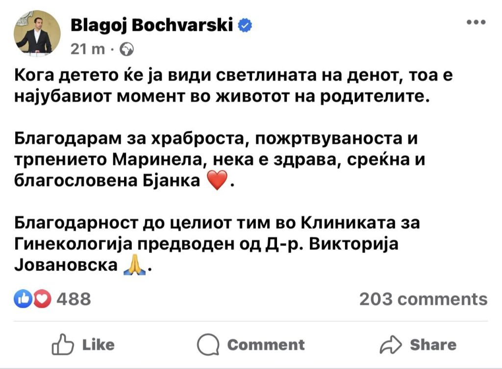 „Кога детето ќе ја види светлината на денот, тоа е најубавиот момент во животот на родителите. Благодарам за храброста, пожртвуваноста и трпението Маринела, нека е здрава, среќна и благословена Бјанка. Благодарност до целиот тим во Клиниката за Гинекологија предводен од Д-р. Викторија Јовановска“, напиша Бочварски на Фејсбук.