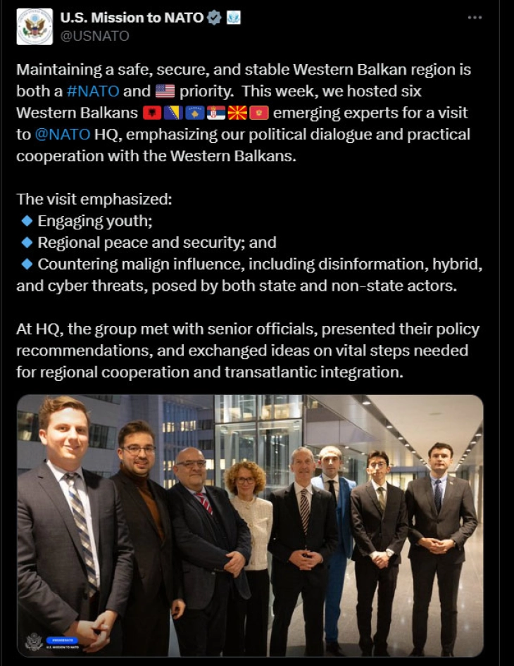„Оваа недела, бевме домаќини на шест експерти од Западен Балкан – од Албанија, Босна и Херцеговина, Србија, Северна Македонија и Црна Гора – во седиштето на НАТО, истакнувајќи го нашиот политички дијалог и практична соработка со Западен Балкан“, се нагласува во објава на Мисијата на САД во НАТО на платформата X.