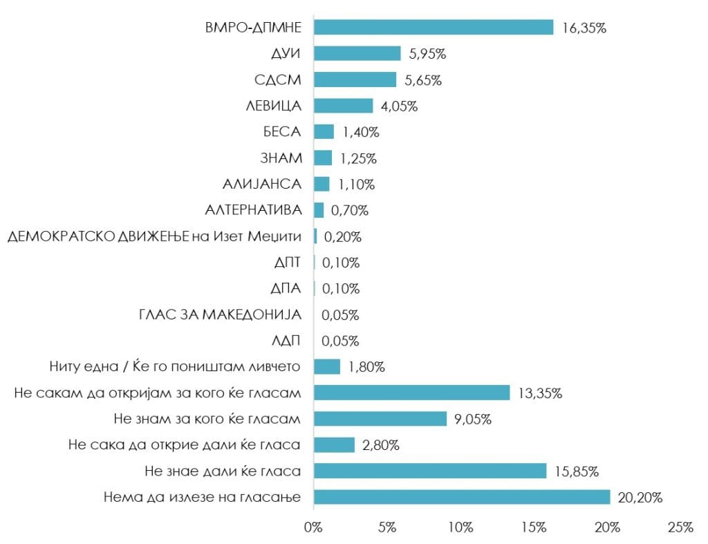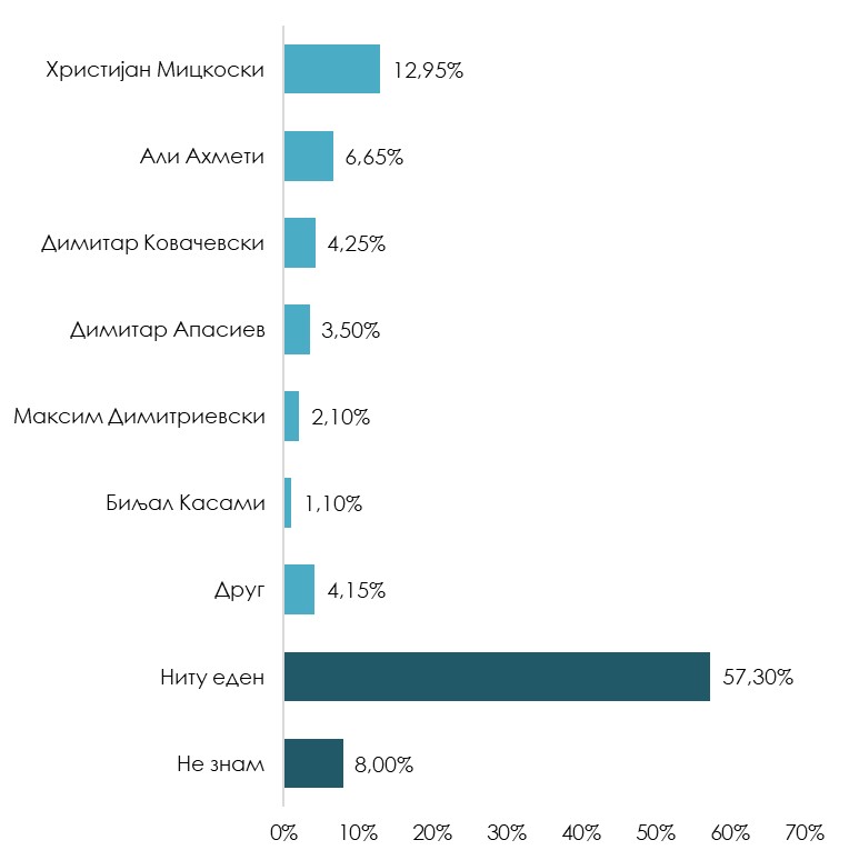 На прашањето „во кој лидер на политичка партија имате најголема доверба“, 12,95 отсто од испитаниците го посочија името на Христијан Мицкоски, лидерот на ВМРО-ДПМНЕ. 6,65 отсто од нив го избраа Али Ахмети, лидерот на ДУИ, во актуелниот премиер и претседател на СДСМ Димитар Ковачевски доверба имаат само 4,25 отсто од гласачите, во Димитар Апасиев, првиот човек на Левица 3,5 %.