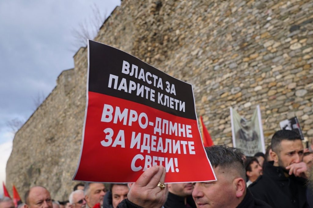 „на што ме разочарува и она што создава едно би рекол посебно чувство на гнев е што после 68 месеци откако оваа Влада е избрана со ветување за живот, со ветување дека ќе ги решат сите отворени проблеми посебно со соседите, можете да видите денеска имаме во главниот град на нашата Македонија мерки за обезбедување од највисок степен, од прв степен, хеликоптери летаат или може да заклучам дека не само што не ги решиле туку ги продлабочиле. Ја опљачкаа, ја уништија, ја ограбија Македонија и ја поделија Македонија. Колку побргу заминат толку подобро ќе биде за сите нас“ – рече Мицкоски.
