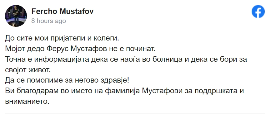 „Мојот дедо Ферус Мустафов не е починат, но вистина е дека е во болница и се бори за својот живот“, напиша неговиот внук.
