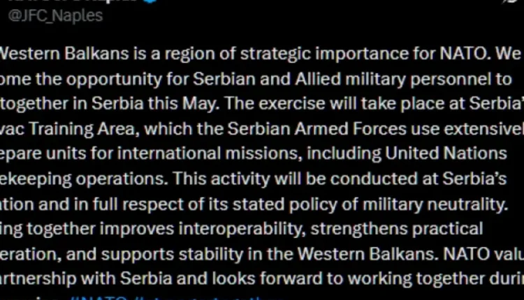 Командата на здружените сили на НАТО во Неапол објави дека ќе одржи вежба со српската армија во мај. Командата на својот профил на социјалната мрежа X објави дека вежбата ќе се одржи на покана на Србија.