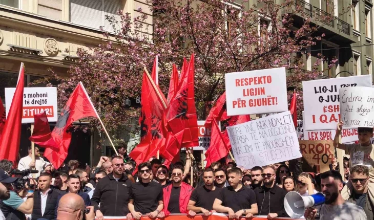Со албански и американски знамиња, како и со транспаренти „Стоп за институционалната дискриминација“, студенти протестираа барајќи правосудниот испит да може да се полага и на албански јазик.
