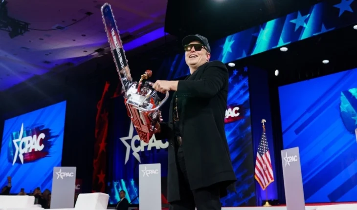 „Ова е моторна пила за бирократијата“, рече Маск, држејќи го алатот над главата на Конференцијата за конзервативна политичка акција во Националното пристаниште, Мериленд, во февруари.