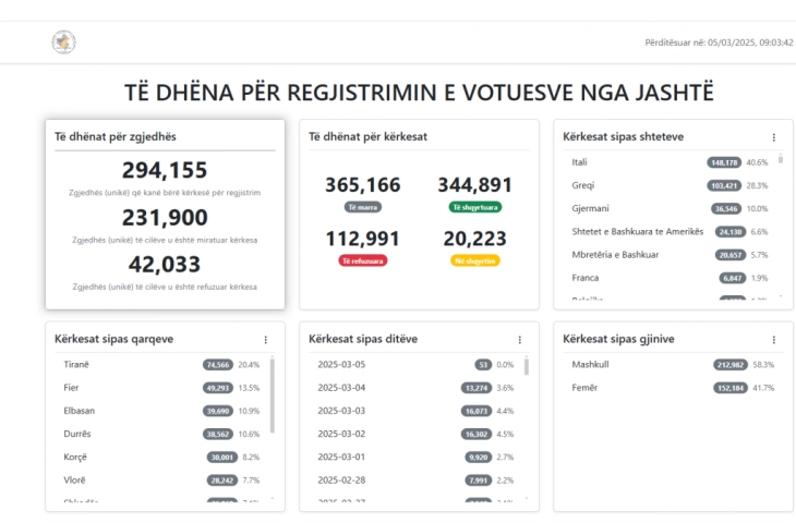-Од 11 јануари кога почна пријавувањето на Платформата за електронска регистрација (ПЕР) за учество на парламентарните избори, па се до 4 март на полноќ примени се 294.155 барања за регистрација, при што до денес одобрени се 231.900. На 42.033 барањето им е одбиено, додека 20.222 барања се во постапка на разгледување. По регистрацијата соодветните служби во рок од пет дена треба да потврдат дали барањето е одобрено или одбиено, информираа од комисијата.