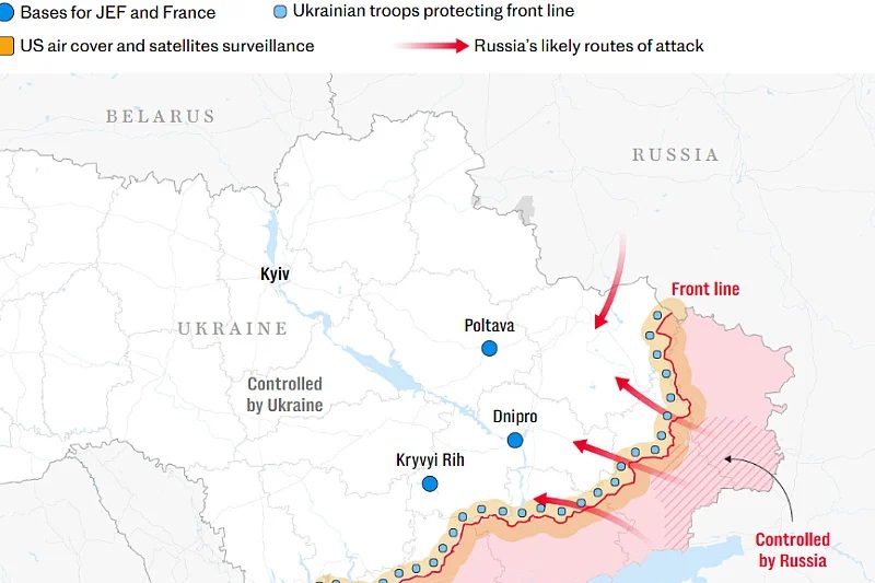 Според англо-францускиот план, помалку од 30.000 војници предводени од Европа ќе бидат распоредени во украинските градови, пристаништа и други критични инфраструктурни локации, како што се нуклеарните централи, далеку од сегашните линии на фронтот.