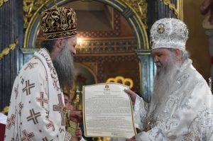 Порфириј – патријархот на Српската православна црква денеска во Соборниот храм во Белград му го врачи томосот на архиепископот охридски и македонски г.г. Стефан за признавање на автокефалноста на Охридска архиепископија.