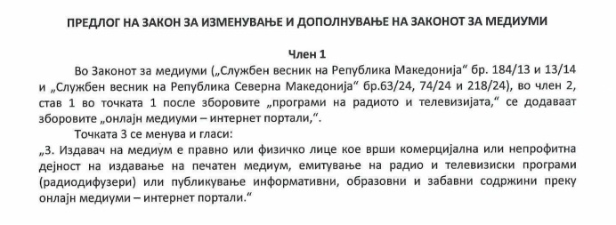 „Доколку има впишано дејност во Централниот регистар на Република Северна Македонија, има седиште и уредништво во Република Северна Македонија и на свое име има регистрирано македонски .мк или .мкд интернет домен“, пишува во предлог-изманите.