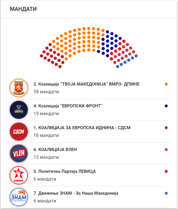 Државната изборна комисија информира дека од обработени 99,6 отсто од податоците на вчерашното гласање за парламентарните избори во Македонија коалицијата на ВМРО-ДПМНЕ – Твоја Македонија освои 58 пратенички места, коалицијата на СДСМ 18, ДУИ 19, коалицијата Вреди 13, а Левица и ЗНАМ по 6 мандати.